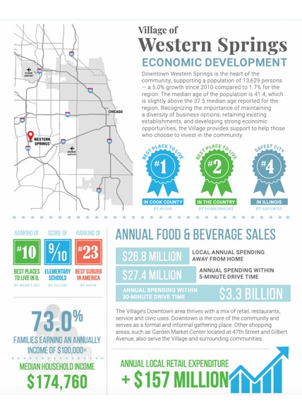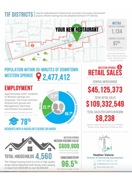 Turnkey restaurant space in the heart of downtown Western Springs. Outstanding vehicular and foot traffic area with prime street visibility. Large, exclusive outdoor patio seats 45-50 guests. Private event room / dining room. All kitchen equipment, cold & dry storage, walk-in refrigerators and freezer, bar equipment, draft system, TVs, security system and furniture included. Has existing cable, internet, PoS, TouchTunes and other amenities ready to go. ADA compliant with clean health inspection as of January 31st, 2026. Located in Western Springs TIF District with funding available. Western Springs has been nationally ranked in the Top 3 across multiple outlets as safest, wealthiest, and best overall places to live 2024-2026. An unmatched location for your restaurant or similar operation. Call to inquire: (708) 505-5462