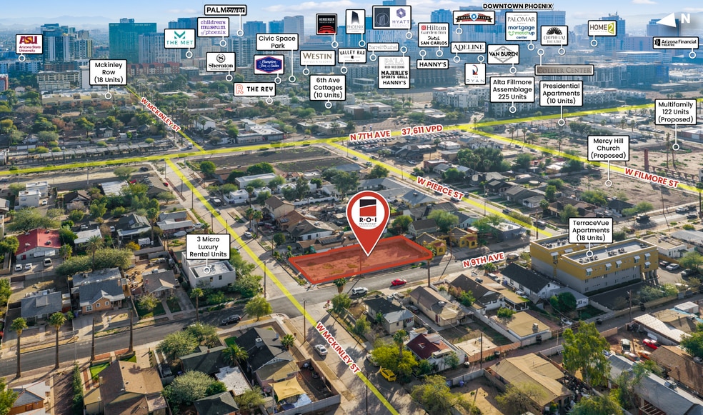 This 7,076 SF (0.162 AC) lot is located on the southeast corner of 9th Avenue and McKinley. The site sits just west of Downtown Phoenix and roughly a quarter mile south of the I-10. The R-5 zoned land includes shovel ready plans for a 6- unit townhome-like bespoke project (“The Doris”). The surrounding area is characterized by single family homes and smaller multifamily and townhome projects recently completed and / or proposed. Grand Avenue has also seen a strong resurgence with local in-demand restaurants such as Bacanora PHX.