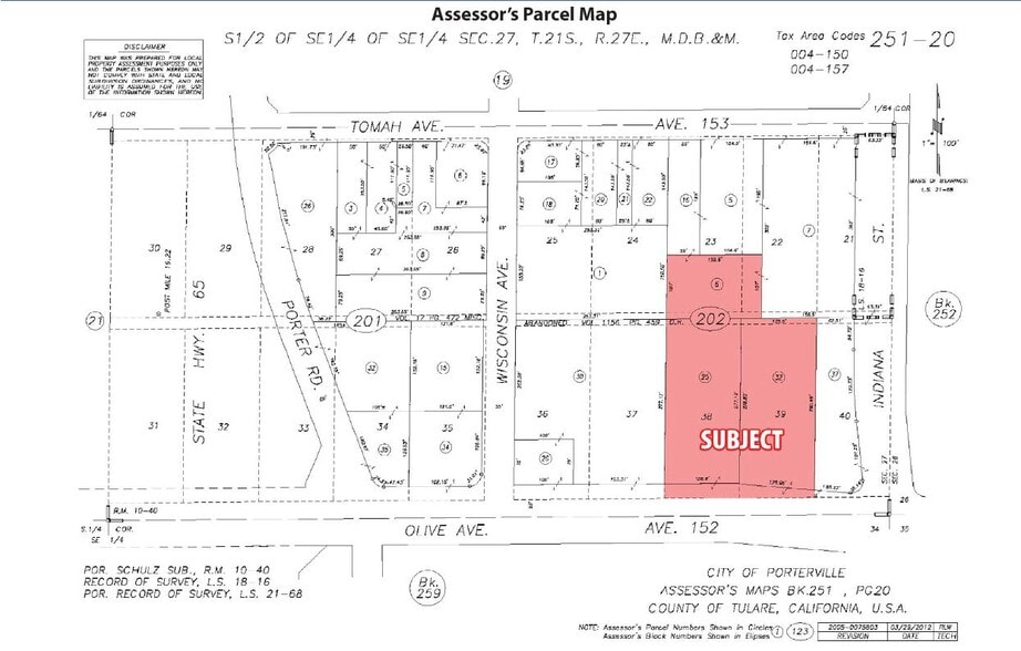 The subject property consists of 3 separate legal parcels, to be sold together or separately, totaling 2.18± acres. The property contains a small metal building consisting of roughly 1,000 square feet with a fenced in yard. There is no value factored into the purchase price for the building. The curb, gutter and sidewalk are in place and all utilities are either on-site or within close proximity to the property. The subject property is located along the Olive Avenue corridor near State Hwy 65 ramps in Porterville, CA. The site is less than a half-mile from Porterville High School and about 1-mile from Downtown Porterville. This centrally located, infill property is near many retailers and restaurants such as Starbucks, Black Bear Diner, Auto Zone, O’Reilly Auto Parts and Smart N Final. The property is also surrounded by homes and industrial property, providing for a strong daytime population in the area.