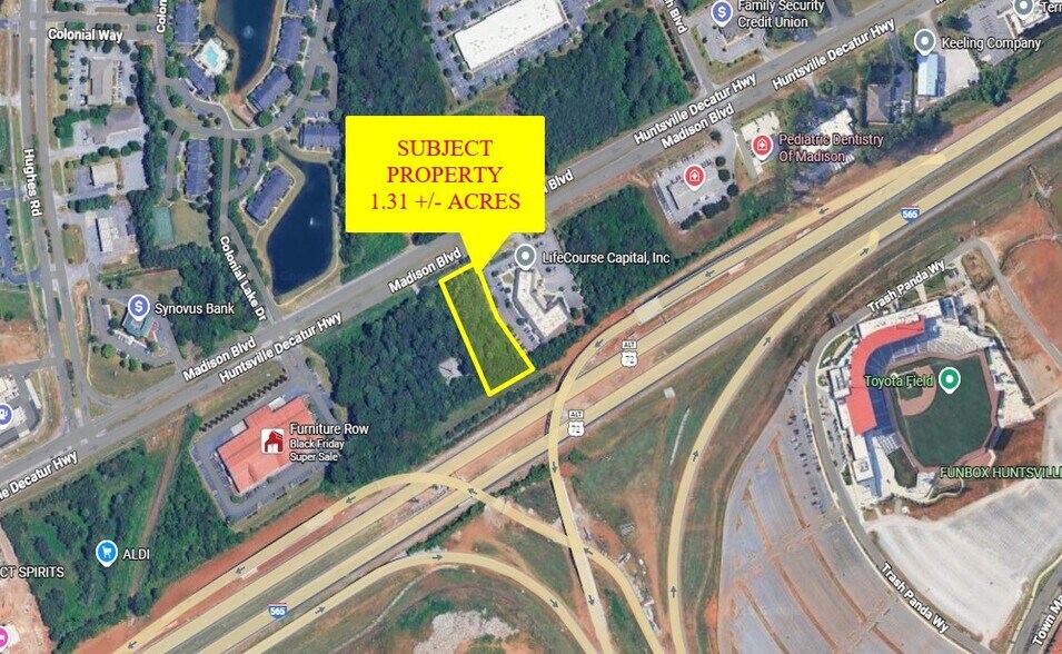Prime commercial lot for sale with frontage of 124' on Madison Blvd. Minutes to HSV International Airport and Downtown HSV. South side of the lot faces I-565 for maximum exposure with over 110,000 vehicles per day from Madison Blvd. and I-565. Retail, office and/or possible billboard revenue for this site generating added owner/operator income per month.