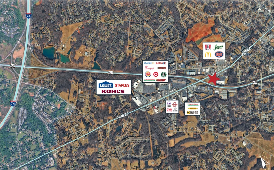 7,800 SF Freestanding Building Immediate Occupancy Available Located on Main Street in Kernersville, NC Kernersville is located in Forsyth County within the Piedmont Triad, near Winston-Salem, Greensboro, and High Point Convenient access to I-40 and Hwy 421 Excellent visibility and frontage on Main Street Signage Opportunity Flexible building layout suitable for retail, showroom, medical, office, or service uses On-site parking available Located in an established commercial corridor with surrounding retail and service businesses