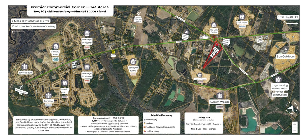 ±14 acres of prime commercial land located at the high-growth intersection of Hwy 90 and Old Reaves Ferry Road in Conway, South Carolina. This strategically positioned corner site sits just ±100 feet off Hwy 90 with full visibility and benefits from a planned SCDOT round-about, creating a true hard-corner commercial opportunity. The property is zoned CFA (Commercial Farm Agriculture), one of Horry County’s most flexible commercial zoning designations, allowing a wide range of uses including retail, grocery, fuel, QSR, medical, storage, flex, service, and mixed-use development. The site’s geometry provides excellent ingress/egress options and supports pad sites, outparcels, or a full anchor-driven commercial plan. The Hwy 90 corridor is experiencing explosive residential expansion. More than 3,500 new homes have been delivered since 2018 with thousands more approved or under construction in nearby communities such as Aubern Woods, Chestnut Ridge, Glenmoor, Heritage Preserve, Fieldview, Olde Mill Estates, and several new subdivisions along Old Reaves Ferry. Two schools—Discovery School and Atlantic Collegiate Academy—are within one mile, and the major traffic generator Sun Outdoors is located less than a mile away. The area is significantly underserved, with no grocery within 5.9 miles and no QSR options within 3 miles. This creates a rare retail void and immediate opportunity for essential commercial services. With the planned traffic signal, strong visibility, rapid population growth, and major infrastructure improvements along Hwy 90, this parcel represents one of the most compelling commercial development sites remaining in the western Conway growth zone. Ideal for: Grocery, fuel/convenience, retail center, QSR pads, medical, self-storage, mixed-use, or long-term commercial investment. Environmental Notes: According to the U.S. Fish & Wildlife National Wetlands Inventory (NWI), there are no mapped wetlands located on the subject 14.17± acres. The existing pond on the east side of the parcel provides a strong opportunity for on-site stormwater retention. High-and-dry upland topography across the developable area supports a wide range of commercial uses. APN: 34400000028 Zoning: CFA Size: ±14 AC