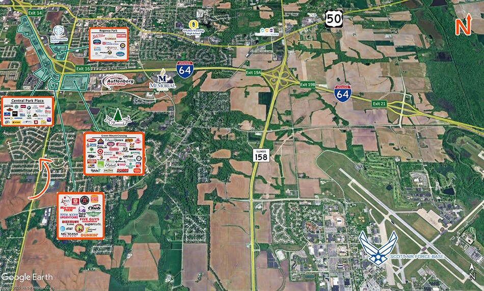 Located near Dierberg’s, Target and Shiloh’s newly developed retail district off of Green Mount Rd and I-64. Short distance from the New Memorial and St. Elizabeth’s (2017) Hospitals. Less than 1 Mile to I-64, Exit 16.