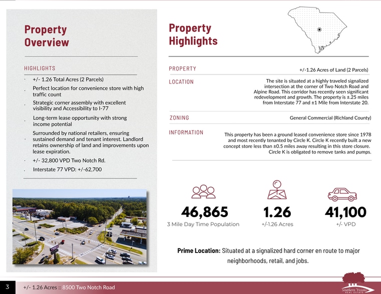 PROPERTY +/-1.26 Acres of Land (2 Parcels) Larger building is 2376 Sq Ft-Not 1333 Sq Ft.-this is the car wash building This property is surrounded by commercial and residential developments. With close proximity to both Interstate 77 and 20, the parcel presents a prime opportunity for a wide range of development possibilities. LOCATION The site is situated at a highly traveled signalized intersection at the corner of Two Notch Road and Alpine Road. This corridor has recently seen significant redevelopment and growth. The property is ±.25 miles from Interstate 77 and ±1 Mile from Interstate 20. INFORMATION This property has been a ground leased convenience store since 1978 and most recently tenanted by Circle K. Circle K recently built a new concept store less than ±0.5 miles away resulting in this store closure. Circle K is obligated to remove tanks and pumps. ZONING General Commercial (Richland County)