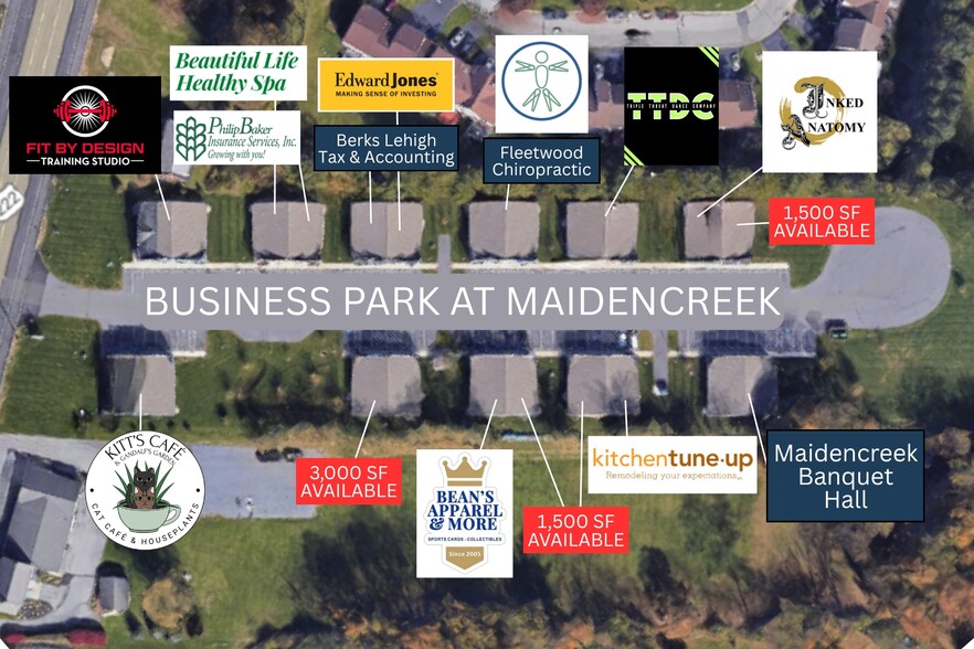 TEMPORARY RENT REDUCTION - $200/month OFF OF MONTHLY BASE RENT - $2400 annual savings! Base rent is now just $1,800/mo. ($14.40 SF) per 1,500 SF of space, NNN. The Business Park at Maiden Creek located on heavily traveled Rt 222 in Blandon/Maiden Creek Township, and is a one minute drive from the massive new East Penn warehouse (930,000 SF) due to be completed in spring of 2026, so this represents and exciting opportunity for a wide variety of food, retail and service businesses. The property is ready for immediate occupancy and consists of 11 buildings with 22 +/- 1,500 SF units. Only one 3,000 SF space remaining (Unit 15-16), fully built out with 4 offices and two garages with roll-up doors - see video for details. Flexible terms and affordable rental rates! Spaces were just completed in 2021, and some have never been occupied. These are some of the nicest commercial flex spaces in the area. Perfect for flex space/small warehouse tenants, professional offices, and retail! Multiple spaces with bay garage doors, ideal for contractor / distribution / small warehouse uses. Customer and employee parking for approximately 100 vehicles. Join our current tenants Fit by Design Training Studio, Beautiful Life Healthy Spa, Fleetwood Chiropractic, Philip Baker Insurance, Berks Lehigh Tax & Accounting, Edward Jones (Coming Soon), Maidencreek Banquet Hall, Beans Apparel & More, Kitchen Tune Up, Inked Anatomy and Kitt's Cafe & Gandalf's Garden. CURRENTLY SEEKING GREAT OPERATORS SUCH AS FOOD, RETAIL, SERVICE BUSINESSES, CONTRACTORS, PROFESSIONAL OFFICE, DISTRIBUTION, ECOMMERCE, PODCAST STUDIOS, FLEX / COWORKING SPACE, HEALTHCARE, SMALL WAREHOUSE, PET CARE, GOLD/SILVER SHOPS, and much more. Call now for a tour of this great property!