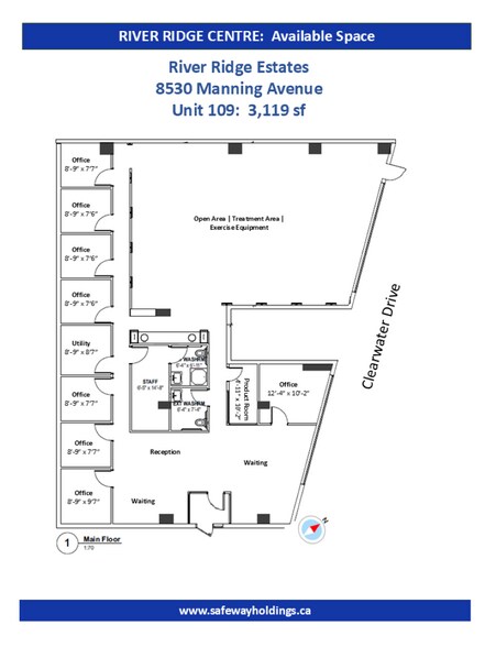 River Ridge Estates is located at 8530 Manning Avenue and forms part of River Ridge Centre. Unit 108 is a prime 1,449 sf retail/office unit facing Clearwater Drive. This retail/offices corner space supported by 294 residential units at River Ridge. Competitive rental rates. Heated underground parking available. Central location near Hospital and shopping. Pylon signage available.
