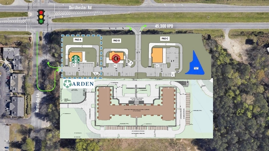 Strategically positioned between Cedar Grove Commons and Publix on the going to work side of Dorchester Road (45,300 vehicles per day), the property features a signalized intersection and excellent highway visibility. The location benefits from co-tenancy with Chipotle and proximity to a newly developed shopping center featuring major retailers including Home Goods, PetSmart, Ulta, Five Below, Ross, and Lidl.