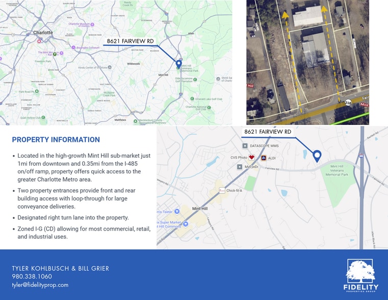 - Special pricing available - Located in the high-growth Mint Hill sub-market just 1mi from downtown and 0.35mi from the I-485 on/off ramp, property offers quick access to the greater Charlotte Metro area. - Two property entrances provide front and rear building access with loop-through for large conveyance deliveries. - Designated right and left turn lanes into the property. - Zoned I-G (CD) allowing for most commercial, retail, and industrial uses.