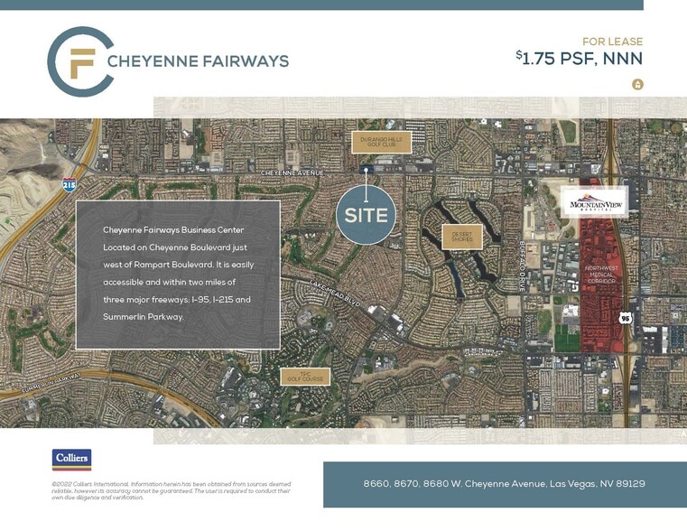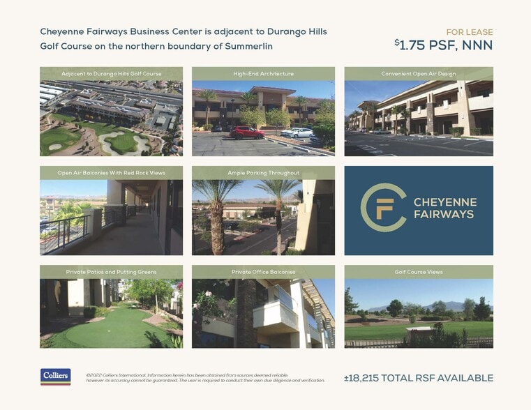 Cheyenne Fairways offers a professional, thoughtfully designed office setting in the thriving northwest Las Vegas market. Located near the 215 Beltway, Summerlin Parkway, and US-95, this property ensures quick regional access and strong connectivity to the Las Vegas Valley. The building provides tenants an elevated work environment with turn-key spec suites, sweeping mountain and golf course views, and full-height glass that maximizes natural light. Professionals benefit from high-end features such as covered parking, building and monument LED signage, and patio or balcony suite options. This well-maintained property includes putting greens on-site and is professionally managed under active, stable ownership. The location provides proximity to major business nodes—including Summerlin, Mountain View Hospital, and Las Vegas Tech Center—as well as convenient access to upscale retail and dining at Tivoli Village and nearby lifestyle amenities. With generous tenant incentive packages, Cheyenne Fairways caters to businesses focused on both productivity and quality of life.