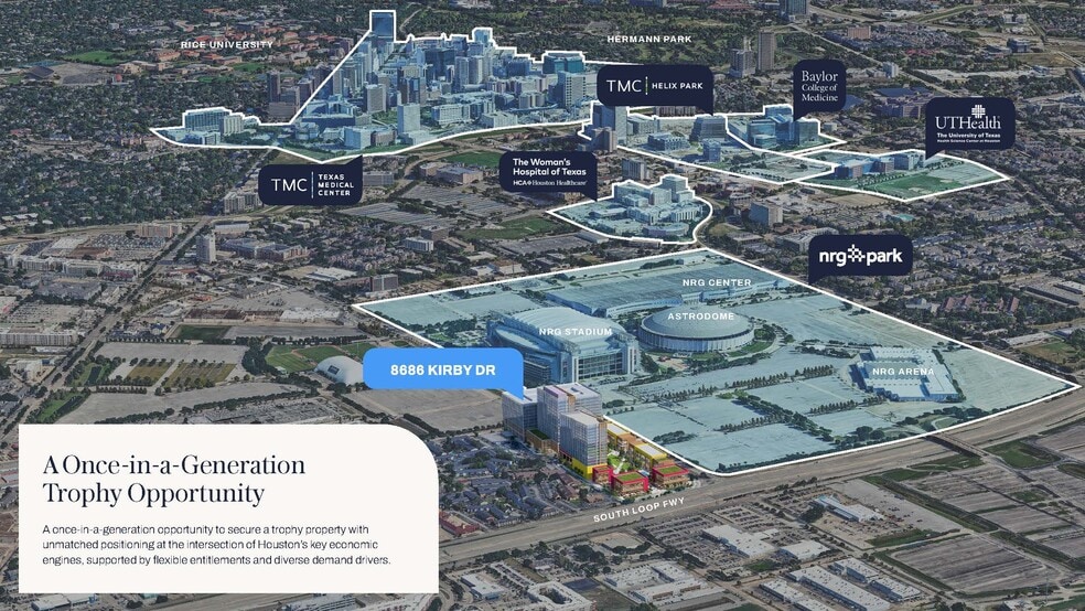 - Adjacent to NRG Park & Texas Medical Center: one of the most active event destinations in the U.S., hosting 750+ events annually and millions of visitors - Medical & life-science adjacency: Minutes from Texas Medical Center, Helix Park, Baylor College of Medicine, UT Health, and major research institutions - Mixed-Use Opportunity - True trophy asset: A once-in-a-generation opportunity to control the front door to Houston’s premier sports and medical district