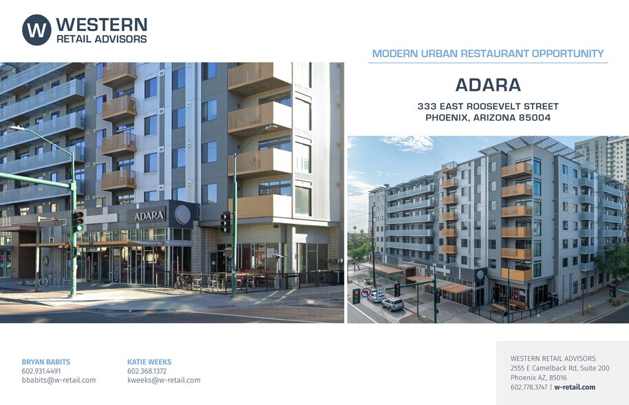 Adara is located within an urban, cultural, walkable district in the heart of Downtown Phoenix’s creative core, adjacent to Roosevelt Row - a nationally recognized arts district known for galleries, murals, and First Fridays art walk events. Close to institutional anchors including Arizona State University’s Downtown campus, bringing steady student and faculty foot traffic. Surrounded by dense residential population and growing multifamily developments. Served by the Valley Metro Rail Roosevelt/Central Ave station - adding transit accessibility for commuters, residents, and visitors.