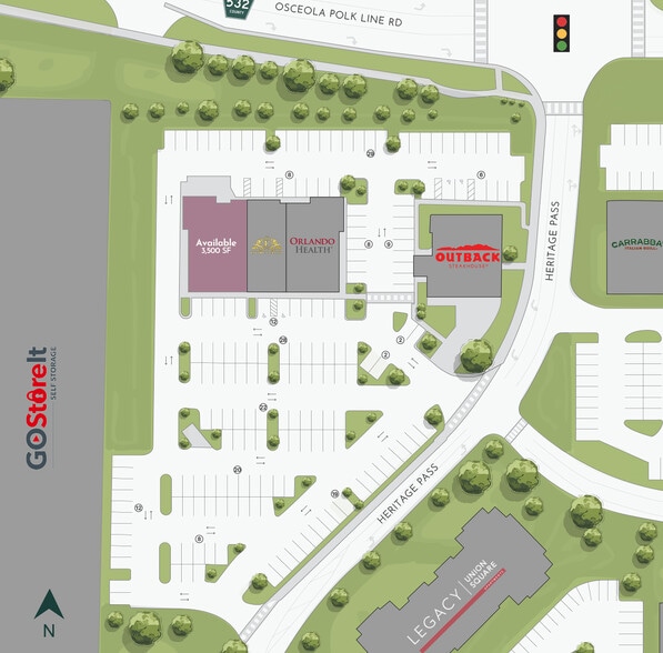 Welcome to 900 Heritage Pass • ChampionsGate in Davenport, FL 900 Heritage Pass is a 10,744 sq. ft. shopping plaza offering a prime 3,500 sq. ft. endcap opportunity with canopied patio space. Anchored by Orlando Health, Encore Nails & Day Spa and freestanding Outback Steakhouse, the 2024-constructed center enjoys excellent visibility along CR-532 (19,300 VPD) with dedicated right-turn access and a lighted intersection. Conveniently located off expanding I-4 Exit 58 (140,500 VPD) in upscale ChampionsGate resort community, the property benefits from proximity to 460-unit Legacy Union Square apartments, affluent residential neighborhoods, championship golf courses and world-renowned Orlando attractions including Walt Disney World and Universal Studios. For additional information, please contact us.