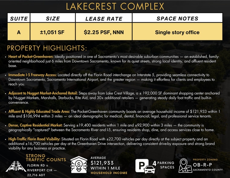 Lakecrest Complex presents a ±1,051 SF single-story office suite available for lease at $2.25 PSF, NNN, ideally situated on high-visibility Florin Road in Sacramento's sought-after Pocket-Greenhaven community. This well-located office benefits from direct I-5 freeway access via the Florin Road interchange, connecting tenants seamlessly to Downtown Sacramento (just 6 miles away), Sacramento International Airport, and the greater region. Positioned adjacent to Lake Crest Village — a ±192,000 SF shopping center anchored by Nugget Markets, Marshalls, Starbucks, and Rite Aid — the suite offers built-in convenience and steady surrounding foot traffic. With ±22,700 vehicles per day passing the property and an affluent, highly educated residential base of ±19,400 residents within one mile, this is an exceptional opportunity for medical, dental, financial, legal, or professional service tenants seeking strong visibility and a captive local market. The suite includes 4 dedicated parking spaces. Zoned OB-R-P, Sacramento County.