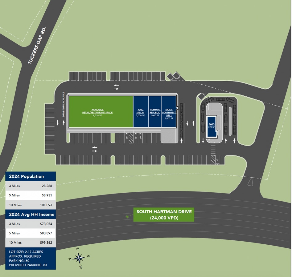 Introducing a prime leasing opportunity in the rapidly growing submarket of Nashville, TN. This project on South Hartman Drive introduces two opportunities. The first opportunity being a multi-unit strip center with 6,320 square feet of available space. Thesecond opportunity will either be a ground lease or a 2,500 standalone building ideal for QSR or retail businesses. Located just off I-40 with 46,000+ vehciles per day, this property is an ideal spot for retail or restaurant tenants. With ample parking and a flexible layout, this location presents an unbeatable opportunity for businesses seeking to make a mark in the Lebanon market.
