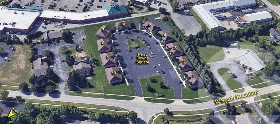 - Less than 1/4 mile to traffic light. - 1/2 mile to expressway. - 10-unit complex built by Melchior Building Company. - On average, Perry Towne Square occupants spend $2.30/sf on utilities. - Perry Towne Square condominium fee is $600 per building.