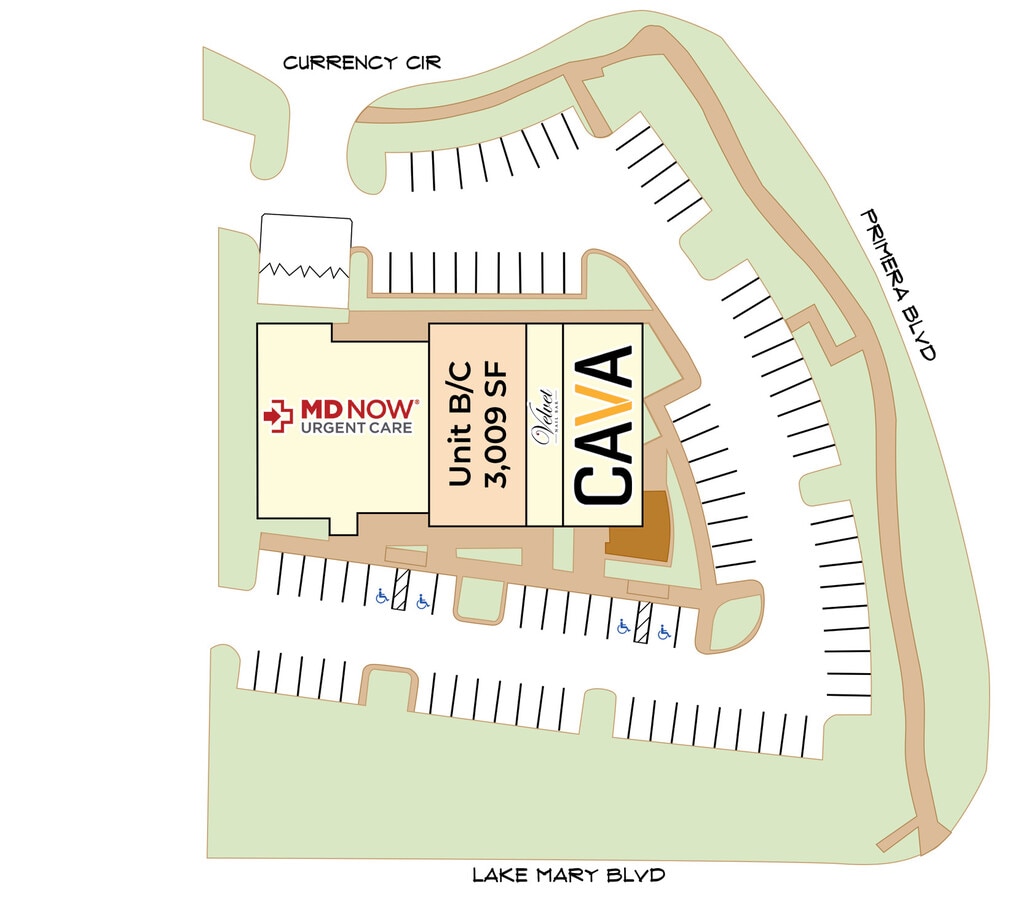 Located directly off Lake Mary Blvd with excellent traffic counts and visibility. 3,009 SF former F45 space suitable for fitness or retail. Strong co-tenancy with Cava and Velvet Nails creating consistent foot traffic. Surrounded by dense office and retail. Situated in a desirable trade area with excellent demographic support. Sufficient parking for customers and employees.