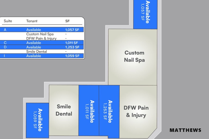 | 1st Floor, Ste Ste I | 1,059 SF | Negotiable | Upon Request Upon Request Upon Request Upon Request | TBD |