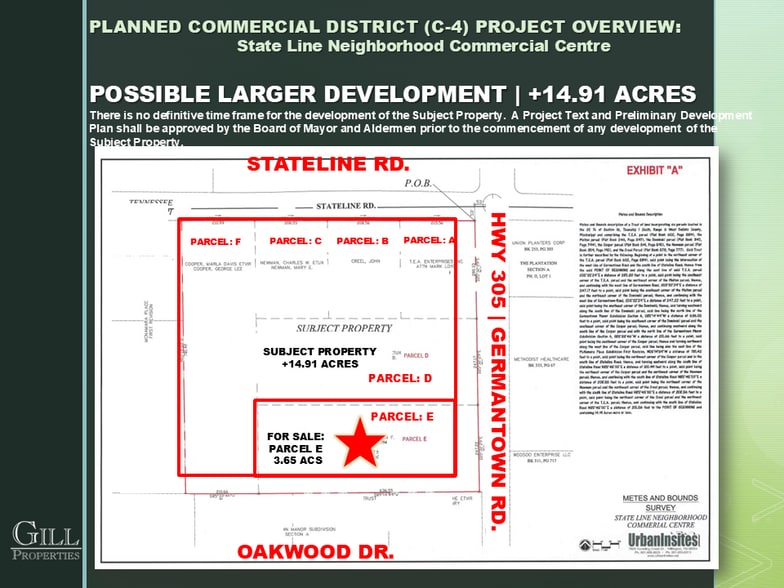 Introducing a prime investment opportunity at State Line Neighborhood Commercial Centre, located at 9045 Germantown Parkway, Olive Branch, MS 38654. This 3.65-acre property features a current estate home and is part of a proposed 14.91-acre commercial project. Strategically positioned in a Planned Commercial District (C-4), this parcel offers a versatile canvas for development. With no set timeline for construction, the project awaits Board approval for development initiation. Boasting a promising concept layout, the property envisions a dynamic mix of office and retail spaces distributed among multiple-use buildings. Surrounded by a robust demographic landscape, the property enjoys excellent proximity to key roads, enhancing accessibility for future tenants. Don't miss the chance to be part of this promising venture. Contact our Senior Vice Presidents of Brokerage, Frank Dyer III CCIM, RPA, and Barry Maynard, for more details. Explore the potential of State Line Neighborhood Commercial Centre today.