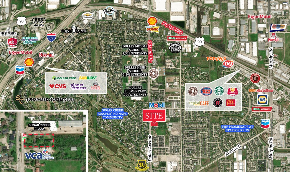 Positioned just south of Highway 90, this ±1.32-acre tract offers great accessibility in the heart of the Sugar Land/Stafford corridor. Located along Dulles Avenue, the site benefits from: