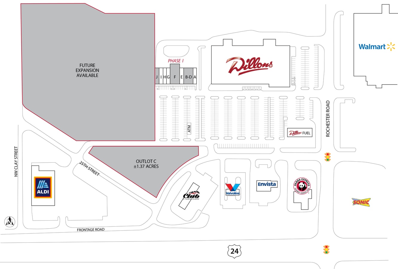 Shopping center located directly off of the junction of NW Topeka Boulevard and Highway 24. Center is currently anchored by Dillons and Walmart, and is located directly across from a Starbucks. Traffic count on Highway 24 nearly 20,000.
