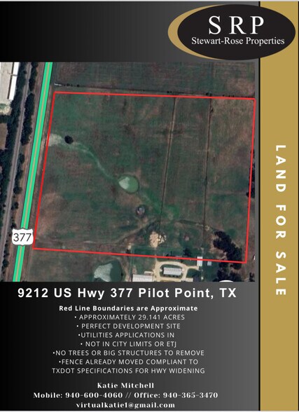 28.044 +/- Acres with 971 ft +/- of Highway 377 frontage for the serious speculator investor. Residential or Commerical development potential. This area is exploding!! This is a chance to get into a large piece of prime acreage before it all gets scooped up!! New fence already installed, per TXDOT specifications for the highway widening project. No expense to tear down existing structures. This is your blank canvas to create your next income producing project. Contact Katie for more information. 940-600-4060. -Water Meter Installed -Not in city limits of Pilot Point or Aubrey -in Aubrey ETJ -Not in flood zone