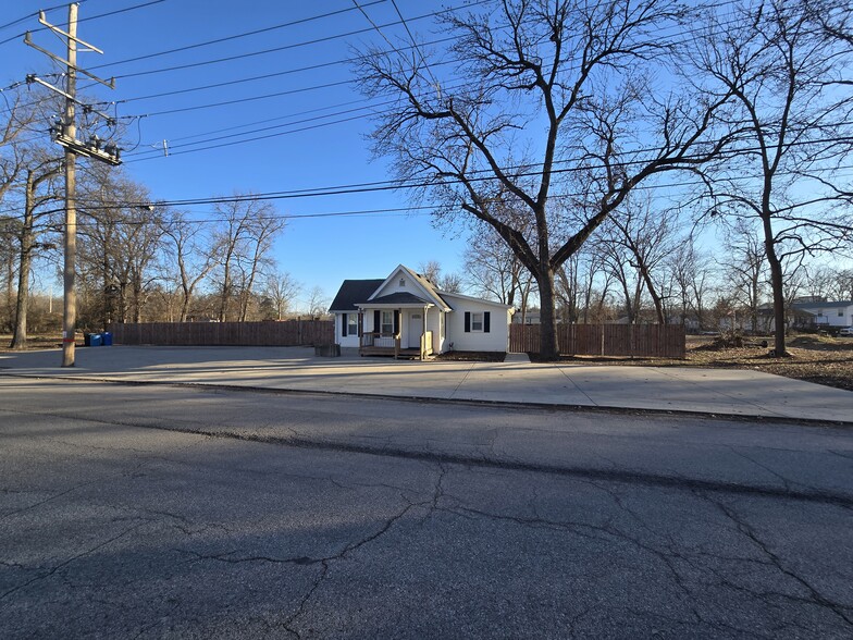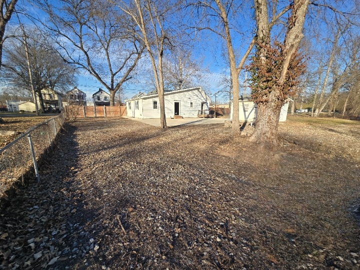 Fully fenced property with compacted gravel behind the building. The side yard is a flat grass lot ready for development.