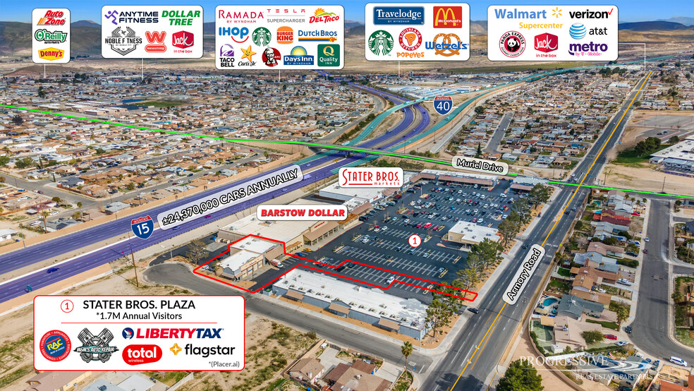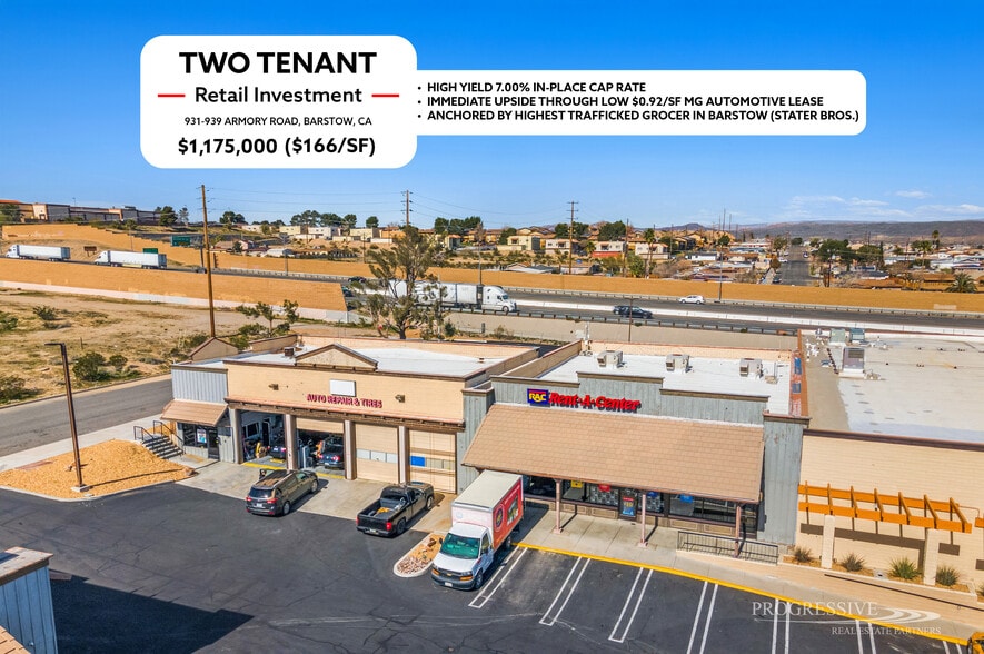 Progressive Real Estate Partners is pleased to present the opportunity to acquire a two-tenant retail building in Barstow, California. The property is anchored by a top-performing Stater Bros. Market, the primary grocery and daily-needs destination in the trade area, benefiting from approximately 1.7 million annual foot visits per Placer.AI. The asset is offered at an attractive 7.00% in-place cap rate, providing strong current income with additional upside, and at a compelling price point of approximately $166/SF, well below replacement cost for comparable grocery-anchored retail product. Rent-A-Center has operated at the property since 1995 and most recently renewed in 2022, demonstrating long-term commitment to the location. M&M’s Auto Repair occupies highly improved automotive space at a below-market $0.92/SF MG rent, creating a clear mark-to-market opportunity. The overall shopping center is 99% occupied, reflecting strong tenant demand. The property abuts Interstate 15, which carries approximately 24 million vehicles annually, and benefits from Barstow’s logistics-driven growth, anchored by BNSF Railway’s $3.8 billion Barstow International Gateway, projected to generate approximately 20,000 jobs.