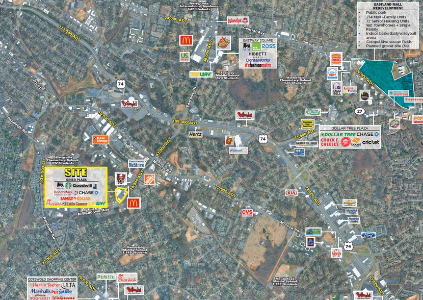 Wendover Plaza features +/- 78,800 square feet of retail with Wendover frontage. This grocery-anchored shopping center is located in the bustling Oakhurst neighborhood with great proximity to Eastover, Cotswold, and Plaza Midwood. Oakhurst features an office/daily employee population as well as +/- 47,000 residences within 3 miles. This site is 1.4 miles from a proposed Light Rail Silver Line stop.