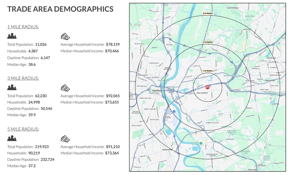 Located just off Silver Lane Exit of I-84. Situated in central area of East Hartford. Easy access to Rt 84 and Rt 384. Well located center in the middle of dense residential are. Adjacent to the soon to be constructed, 470 Unit Concourse Park residential development. Located in close proximity to Rentschler Field, with proposed redevelopment plans to include several million square feet of warehouse and research and development office space. Parking: 1,038 spaces.