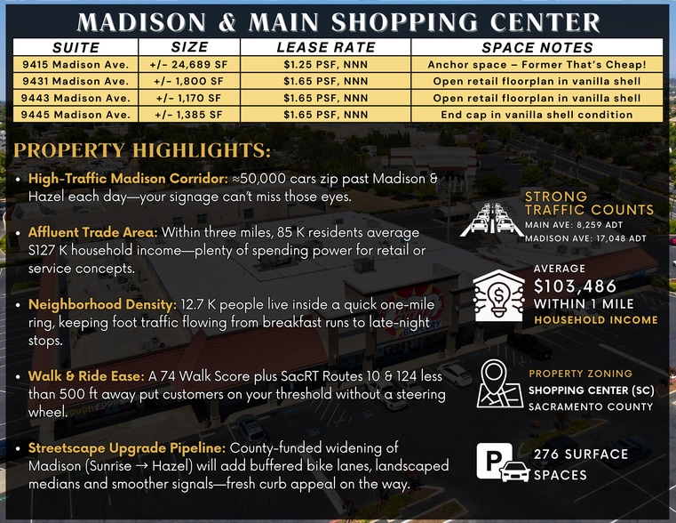Madison & Main Shopping Center anchors one of Orangevale’s most visible intersections, offering flexible retail suites from ±1,170 SF up to ±24,689 SF, including an anchor opportunity in the former “That’s Cheap!” location. The center features strong daily traffic along Madison Avenue, excellent signage visibility, and a diverse tenant mix including Wells Fargo, Domino’s, and Ashley’s Country Kitchen. Surrounded by established neighborhoods and major arterials, the property serves as a convenient retail hub for local residents and commuters traveling between Fair Oaks, Citrus Heights, and Folsom. With ongoing county improvements along Madison Avenue—bringing landscaped medians, upgraded lighting, and improved bike and pedestrian access—the location continues to gain appeal and long-term growth potential.