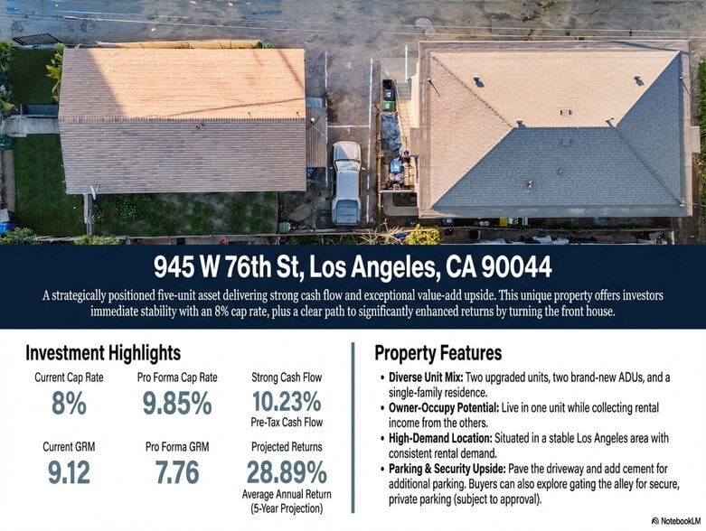 Outstanding five-unit investment property presents an incredible opportunity for investors seeking strong cash flow and significant upside potential. Priced at an 8% cap rate with a 9.12 Gross Rent Multiplier (GRM), this asset offers immediate income with the potential to reach a 10.39% cap rate and a 7.44 GRM by turning the front house and adding a bedroom making it a 3+1. *Key Features* *Diverse Unit Mix: The property consists of two upgraded units, two brand-new ADUs, and one single-family residence (SFR), providing a well-balanced and attractive rental offering. *Perfect for an owner-occupy opportunity. *Strong Market Fundamentals: Located in a desirable area with high rental demand, this property benefits from a stable tenant base and potential for future appreciation. *Upside Potential: By turning the front house investors can achieve a higher return, pushing the cap rate to 9.85%. *Investment Summary* -Cap Rate (Current): 8% -Cap Rate (Pro Forma): 10.39%-GRM (Current): 9.12 -GRM (Pro Forma): 7.44 -Pre Tax Cash Flow: 10.23% -Average Annual Return (over 5 years): 17.99%. ***Please contact us for more information***