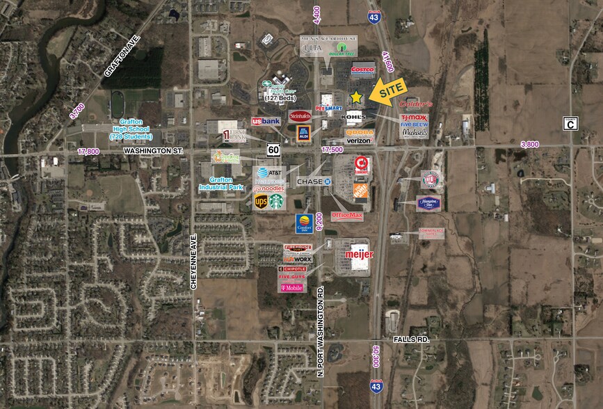Grafton Commons is positioned to capture the affluent Milwaukee Northshore consumer. Located at the I-43/Hwy 60 interchange, with over 1,800' of I-43 frontage. Multiple access points; main access is signalized. Monument and pylon signage available. Anchors include Costco, Kohl's, Dick's Sporting Goods, TJ Maxx, PetSmart, and Michaels. 1,029 parking stalls available (4.4/1,000 sf) provides ample parking for this Class A shopping center.
