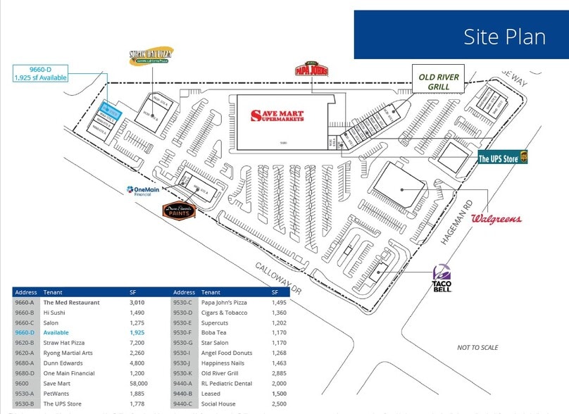 The Plaza at Riverlakes is a high-performing, grocery and drug-anchored neighborhood center strategically positioned at the heavily traveled, signalized intersection of Calloway Drive and Hageman Road in Northwest Bakersfield. Anchored by a 58,000 SF Save Mart and supported by a dynamic mix of daily-needs retailers, services, and restaurants, the center benefits from exceptional visibility, strong vehicular traffic, and convenient ingress/egress in all directions. With over 24,500 employees within a 3-mile radius, household incomes exceeding $100,000, and dense residential neighborhoods surrounding the site, The Plaza at Riverlakes serves as a primary retail hub for the surrounding master-planned communities, including The Links at Riverlakes Golf Course and Centennial High School. The property offers a rare opportunity for tenants to join an established, well anchored trade area with a robust daytime population, stable customer base, and proven retail performance, including the availability of high-demand restaurant, shop space, and a proposed drive-thru pad.