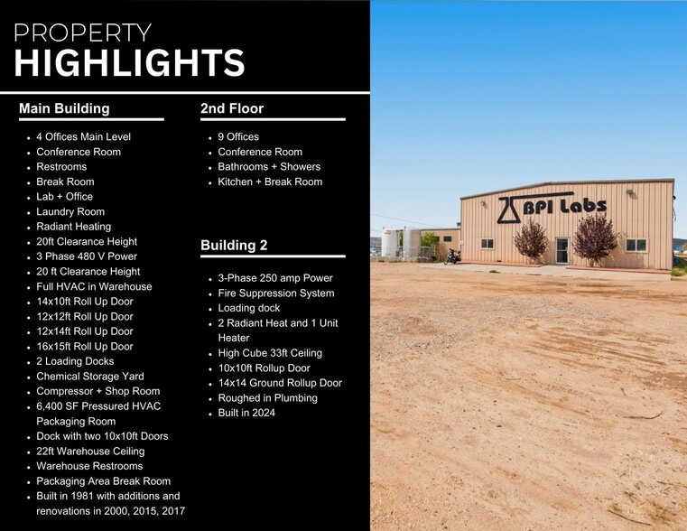 This Evanston, Wyoming manufacturing facility offers 65,674 SF across two buildings on 5.43 acres. The primary building spans 50,770 SF, originally built in 1981 with additions built in 2000, 2015, and 2017. It features 22ft warehouse ceilings, multiple loading docks, roll-up doors, office areas, break rooms, showers, lab space, and packaging rooms. The second building, a modern 14,904 square foot warehouse completed in 2024, offers a high-cube 33ft ceiling for expanded capacity and flexibility. Both buildings are equipped with 3-phase power, ensuring efficiency for a wide range of industrial operations. Strategically designed and updated, this property provides an exceptional opportunity for manufacturing, distribution, or specialized industrial uses in a growing regional market.