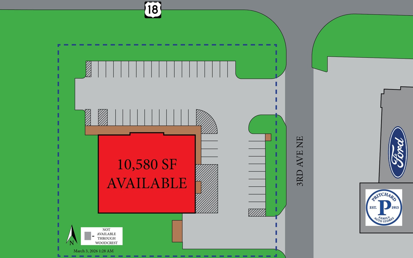 Located at 970 US Highway 18 in Britt, IA, this Freestanding Retail building offers 10,580 square feet of modern, single-story retail space. Built in 2022, this property includes 48 on-site parking spaces and is positioned at a great location for businesses looking for retail space in Northern Iowa. With strong visibility and accessibility to serve both local and regional customers, this site sits directly across from Farmer’s Trust & Savings Bank and the Pritchard Auto Company Ford Dealership, near other established commercial uses including East Gate Storage and Dollar General. Located in Hancock County, Britt provides a balance of small-town feel and regional connectivity. On US Highway 18 and a block from Main Avenue North—home to businesses such as Britt Food Center and Britt Bar & Grill—tenants at this location will have potential access of up to 4,000 traveling vehicles per day. The property is also located just 2 miles from the Hancock County Fairgrounds, a major regional draw. Iowa consistently ranks among the top states for low business costs, affordable living, and long-term economic growth, making this an ideal Freestanding Retail leasing opportunity for businesses seeking a visible, accessible, and cost-efficient home for their operations in Northern Iowa. Commercial space in this Freestanding Retail building is generally suitable for anything from traditional retail storefronts and restaurants to offices to medical or other professional service providers. Woodcrest Capital welcomes first time and franchise businesses to its centers with easy-to-read leases and flexible terms. Woodcrest is also sufficiently sophisticated to please the largest of national credit tenants. As a family-owned business with over 40 years in commercial real estate, Woodcrest owns and operates everything from Class A centers in the busiest neighborhoods to troubled centers it’s rehabilitating in struggling rural communities. Give us a call today to find the right location for your business as we usually have multiple retail opportunities in the immediate area!
