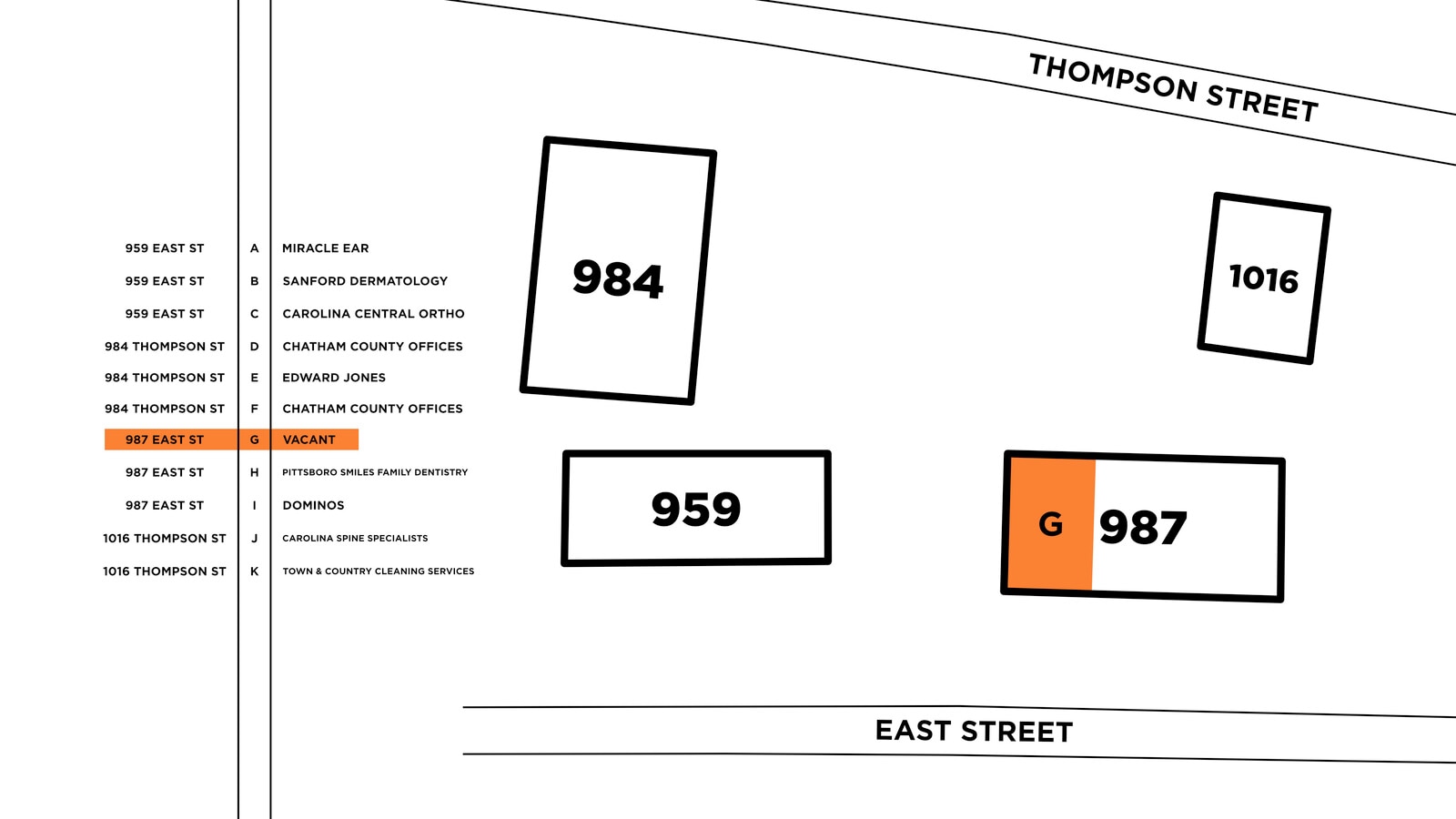 Platinum Commons combines curb appeal with convenience, offering well-kept buildings, lush landscaping, and plentiful parking in a prime Pittsboro location. Anchored by a mix of local and national tenants across retail, office, and medical uses, the property attracts steady traffic and strong visibility. The available suite (987-G) is fully move-in ready with fresh renovations including LED lighting, modern LVT flooring, updated paint, two large restrooms, a kitchenette, and new drop ceilings. Perfect for office, medical, or retail users. Please note: food and beverage concepts are not being considered.