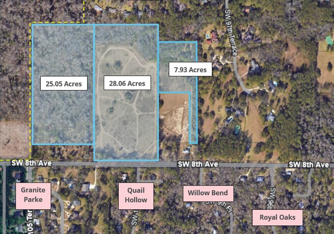 The 61± acres is comprised of three tax parcels (06663-003-004, 06663-002-000 and 06663-004-000) and is located in unincorporated Alachua County. The property has a land use designation of Low Density Residential (1-4 du/acre) and a zoning designation of Residential Single Family Estate (RE-1). The property is currently vacant with approximately 40% of the property open grass areas and 60% of the land with tree cover. The tree cover includes all of the western tax parcel of 06663-004-000 which previously was designated as “Significant Uplands”. The surrounding properties include Fort Clarke Forest subdivision to the north, Tomoca Hills subdivision to the east, SW 8th Avenue and Quail Hollow/Granite Parke subdivisions to the south, and vacant Conservation designated lands to the west. SW 8th Avenue is a two-lane roadway with collector characteristics, which is owned and maintained by Alachua County.