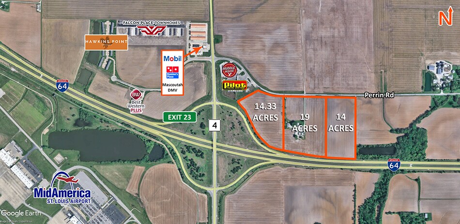 The site is located just off Interstate 64 at Exit 23, and State Route 4 — offering excellent accessibility for both local traffic and travelers. It is in close proximity to MidAmerica St. Louis Airport and Scott Air Force Base.