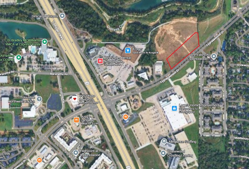 1.5 to 5.0 Acres PAD SITES with approximately 726' of frontage on Cypresswood Drive. $25 psf.