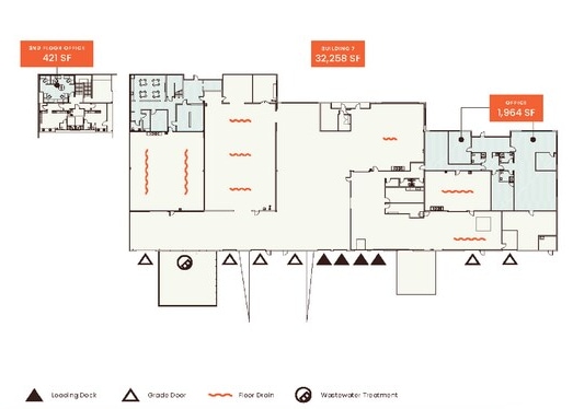 - On-site wastewater treatment; Floor drains and air-handling equipment in place; Build-ready temp-controlled production and storage areas