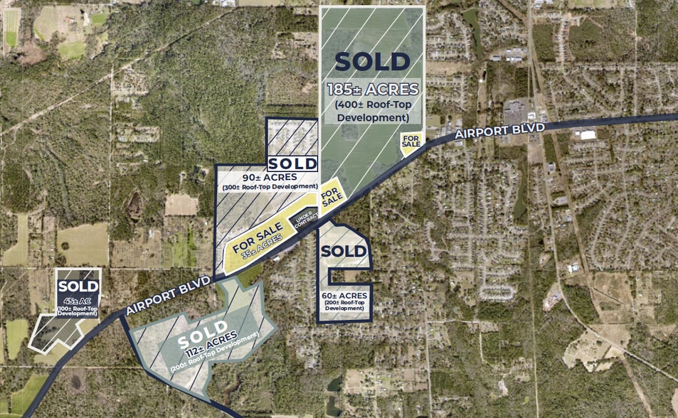 2,138 Feet of Frontage on Airport Blvd. surrounded by 5 new development multi-family communities. Perfect development site for a grocery-anchored shopping center. Located in the northwest quadrant of Airport Boulevard and Eliza Jordan Road. Immediate area features numerous multi-family communities & retail making this an ideal location for a shopping center.