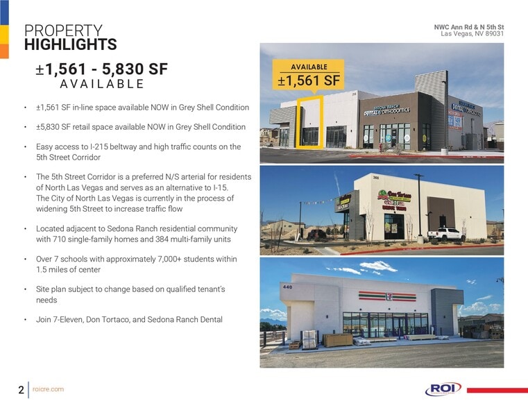 ±2,711 SF In-line space available (Available Now) ±5,830 SF planned future retail (June 2026 est. Completion) • Easy access to I-215 beltway and high traffic counts on the 5th Street Corridor • The 5th Street Corridor is a preferred N/S arterial for residents of North Las Vegas and serves as an alternative to I-15. The City of North Las Vegas is currently in the process of widening 5th Street to increase traffic flow • Located adjacent to Sedona Ranch residential community with 710 single-family homes and 384 multi-family units • Over 7 schools with approximately 7,000+ students within 1.5 miles of center • Site plan subject to change based on qualified tenant’s needs • Join 7-Eleven, Don Tortaco, Bliss Car Wash, and Sedona Ranch Dental