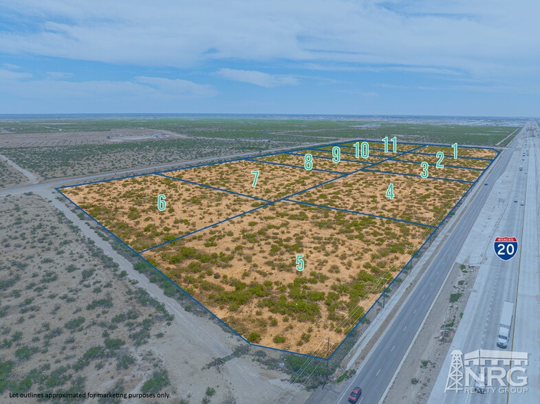 Take advantage of these premium land lots! Part of this 54.49 Acre tract, these lots have a combined ~2,320 feet of frontage along Interstate 20, providing excellent visibility and access. This developer is known for their large foot print, modern industrial service facilities and can build a custom solution for your needs from 14,000 to 80,000 SF. 20-ton cranes, wash-bays, executive office space, and more. The lots are located outside the city limits and features mostly level terrain, making it ideal for industrial or commercial use. Lots can be leased as shown or combined for more acreage to suit the user's needs. Available for lease or build-to-suit offering flexibility for a variety of development opportunities. Developer is building a 16,000 SF state-of-the-art spec building on Lot 1 coming soon! Contact Jus n Dodd to set up shop in this premium location to service the Midland-Odessa community. Click "View Video" button on to see a 360 map view of the property!