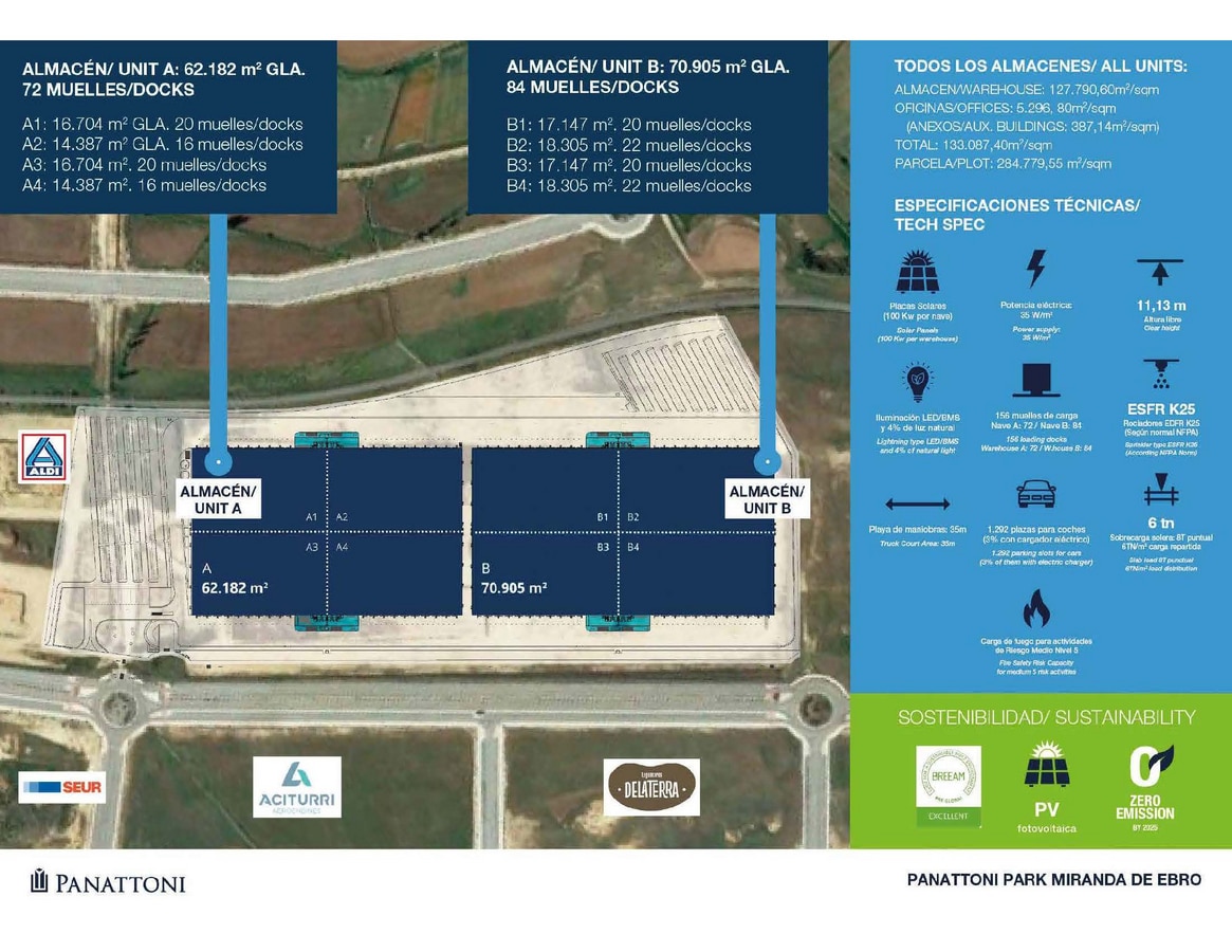 Unit A1 offers a spacious and versatile logistics or industrial space within Panattoni Park Miranda de Ebro. With a total area of 16,704 square meters, this unit is designed to accommodate large-scale operations, providing high ceilings, modern warehouse specifications, and excellent access for transportation and distribution.