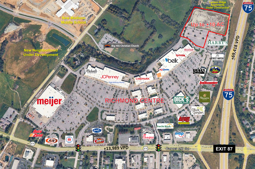 NAI Isaac is pleased to present up to +/-10 acres for sale. Located within the Richmond Centre at Barnes Mill Road & I-75 in Richmond. Excellent I-75 visibility located in Richmond Centre, a 700,000 SF regional shopping center anchored by Meijer, Cinemark, Belk, JCPenney, HomeGoods, TJ Maxx, Dick's Sporting Goods, Ulta and more. Located in Richmond/Madison County – one of the fastest growing communities in Kentucky, Richmond Centre is the dominant retail development in the market and the largest center on I-75 between Lexington, Kentucky and Knoxville, Tennessee.