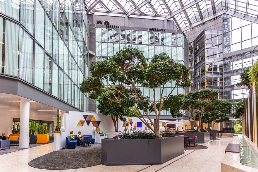 The office space is arranged around a striking enclosed atrium facility, with two office blocks forming an L-shaped structure, where floors are connected by glass clad link bridges which overlook a stunning atrium. The atrium itself incorporates the street area available for communal break out purposes, together with a restaurant, gymnasium, conference facilities and meeting rooms. The office areas are principally open plan in design, but easily partitioned without compromising natural light or air-conditioning. On-site parking is provided in two decks of basement parking beneath the building and in a separate, two tiered car park adjacent.