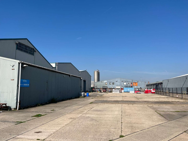 Unit 7 comprises a steel frame truss roof industrial building with 3 roller shutter loading doors to the side elevation. The unit has an eaves height of 6.09m (20’). In addition there is a lean-to extension to the front which has an eaves height of 4.36m (14,4”). Unit 8 comprises a steel portal frame building with roller shutter loading doors to the front and side elevations. It has an eaves height to the under haunch of 8.11m (26’7”).