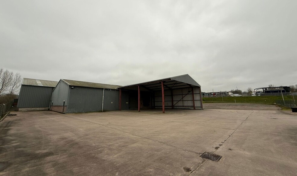 The front warehouse unit is of steel portal frame construction with part brick and block profile clad elevations underneath a pitched steel/asbestos profile clad roof with three front dock level loading points and separate roller shutter loading door.