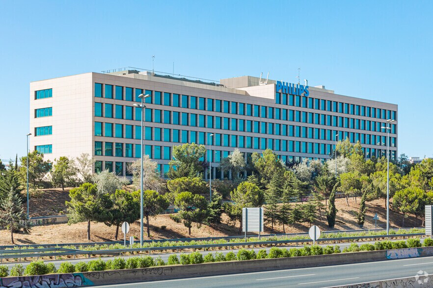 MARIA DE PORTUGAL is an office business complex designed and designed with a clear objective in mind: to create an unbeatable environment for the development of the business activity of first-rate organizations. The strategic location, in Hortaleza, offers a unique opportunity to be part of a dynamic and expanding landscape and business framework. It consists of three exclusive office buildings: two twin buildings of 5,749 m2 each and a third of 5,641 m2 connected together by an impressive central atrium whose design stands out for its high height and great luminosity, in which all kinds of events, presentations and multiple activities can be held. Each block is developed on six floors above ground (ground + 5) with typical floors of 961 m2 and highly representative functional areas. The complex is located inside an enclosed area surrounded by garden fences along its entire perimeter and has double access control. MARIA DE PORTUGAL offers, thanks to its particular architecture and equipment, multiple flexible spaces that adapt to the user and to the new culture of work, encouraging collaboration and internal communication. All this makes it a multipurpose business building of the highest quality, which stands out for its bright open-plan office floors with multiple distribution possibilities to facilitate any implementation. In addition, it has ample parking with spaces for cars, motorcycles and bicycles and electric charging points for cars, as well as outdoor parking. The complex has its own facilities and services such as concierge and 24-hour security, access control and CCTV, butler box office, shuttle service, common rest areas and a wide range of possibilities through its Merlin Hub application, all for the enjoyment of all its tenants. As if that weren't enough, the common areas have been recently renovated and their façade enjoys a high impact and maximum visibility from the A-1. MARIA DE PORTUGAL's location in the north node of Madrid means it has an enormous variety of services nearby. In its surroundings it is possible to find a wide range of services, ranging from restaurants, banks, gas stations, nurseries and pharmacies, to shopping centers where you can make daily or last-minute purchases. All this, in a radius of approximately 5 to 15 minutes walking. It also has nearby hotels such as Hotel NH Las Tablas and Hotel Exe Madrid Norte. To complete the impressive range of services, the environment is very close to the C. C. Sanchinarro shopping area - El Corte Inglés stores, Mercadona, Lidl, Aldi supermarkets, etc. As far as MARIA DE PORTUGAL's communications are concerned, the complex is directly connected to the A-1 and is very close to important logistics and transport centers such as Madrid airport, Chamartín Station or Plaza de Castilla, located just 10 minutes away. Its proximity to Madrid Nuevo Norte, the largest European urban project in the coming decades, will undoubtedly benefit its public transport connection thanks to the future creation of a new transport infrastructure for the area and the reinforcement of existing resources. The venue has several interurban bus lines located a few meters away and is just a few minutes' walk from the María Tudor light rail line ML1. MERLIN HUB The María de Portugal, 3-5 complex is part of Merlin Properties' pioneering project known as Merlin Hub Madrid Norte, the largest “Business Hub” in Europe. Merlin Hub consists of 41 buildings located in the A-1 area, the northern area of Madrid and the municipalities of Pozuelo de Alarcón and Las Rozas. The project offers an innovative, intelligent and secure fusion of nearby workspaces. geographically, in order to facilitate a business ecosystem, an unforgettable work experience and a wide range of exclusive services to its community of workers. Merlin Hub members have the possibility to interact and manage their daily lives through a simple and convenient App, which allows them to access a wide range of services: management of access control to buildings; use of all sustainable mobility alternatives and transport on demand (carsharing, carpooling platform, intelligent parking, bike paths, etc.); consultation of events and conferences; access to local restaurants, etc. Merlin Hub is one of the global references at the business level in photovoltaic solar energy generation, carbon footprint reduction and solidarity and innovative projects.