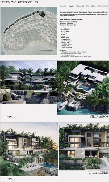 The Seven Wonders Villas offer a collection of ultra-luxurious, private properties designed to provide the ultimate in comfort and sophistication. Each villa is uniquely designed with breathtaking views, expansive living spaces, and state-of-the-art amenities. Starting at $16,050,000.00 Square Footage: 11,517 sqft Number of Bedrooms: 8 Number of Bathrooms: 11 Key Features: Yacht Dock 2 Kitchens 2 Living rooms SPA Gym Maid Room Study Room 2-Car Garage Infinity Pool Outdoor kitchen Ocean view Fully Furnished Amenities: Shopping Center within walking distance Various shops and restaurant